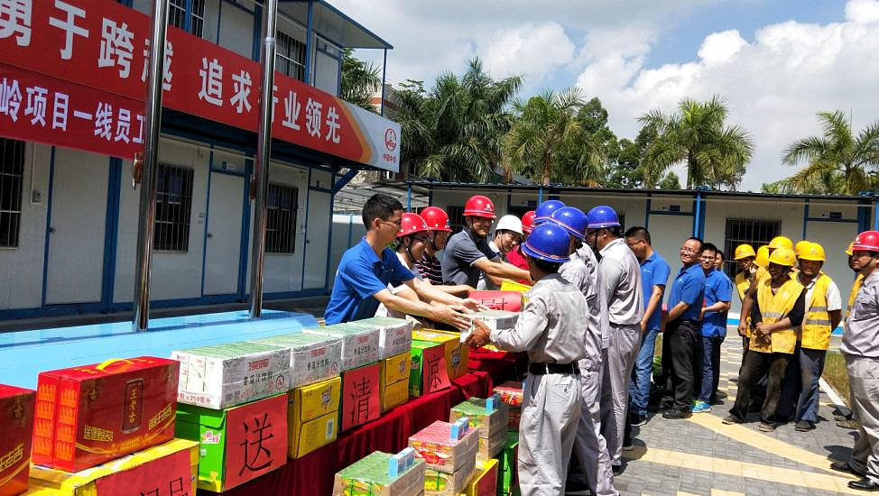 活動中,梁振澤經理首先對在高溫酷暑環境下始終奮斗一線的員工表示了感謝,并希望項目部全體員工保持工作狀態,克服夏季施工難題,確保完成9·30通水目標。隨后,北控橫嶺項目經理梁振澤、橫嶺廠廠長萬巍、揭陽項目經理凌利云、黨支部書記劉軍為全體員工發放了涼茶、飲料、西瓜等防暑慰問品。此外,項目部施工區還設立了茶水間,定期為作業人員送去綠豆湯和防暑降溫藥品,安質部成立了防暑降溫小組,定期為作業人員講解各種防暑降溫小知識,增強作業人員防暑降溫意識,確保全體員工清涼平安度夏。